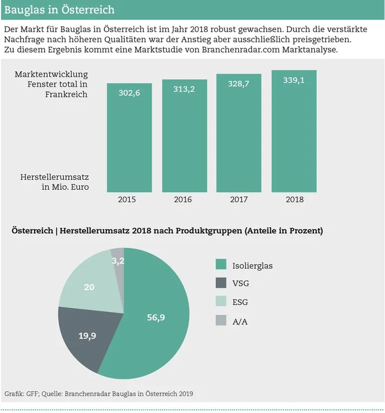 Der Herstellerumsatz mit Bauglas in Österreich wuchs im Jahr 2018 um 3,2 Prozent gegenüber Vorjahr auf knapp 339 Millionen Euro. Der Anstieg war ausschließlich preisgetrieben. Der Absatz stagnierte bei knapp 5,3 Millionen Quadratmetern. Die Durchschnittspreise zogen in allen Produktgruppen an.