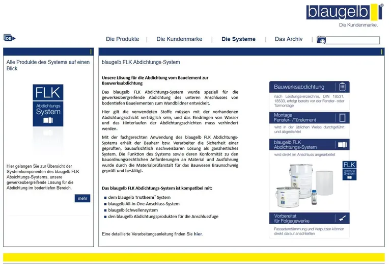 Die Blaugelb Lösung ist von der MPA Braunschweig geprüft, so dass der Bauherr und der Verarbeiter die Sicherheit eines funktionierenden Gesamtsystems mit aufeinander abgestimmten Produkten haben. Auch mit anderen Blaugelb Systemen ist das Abdichtungssystem kompatibel, etwa mit dem Triotherm+ Vorwandmontagesystem, dem All-in-One Anschluss-System, dem Schwellensystem TBS, den Sockeldämmprofilen oder den Abdichtungsprodukten für die Anschlussfuge.