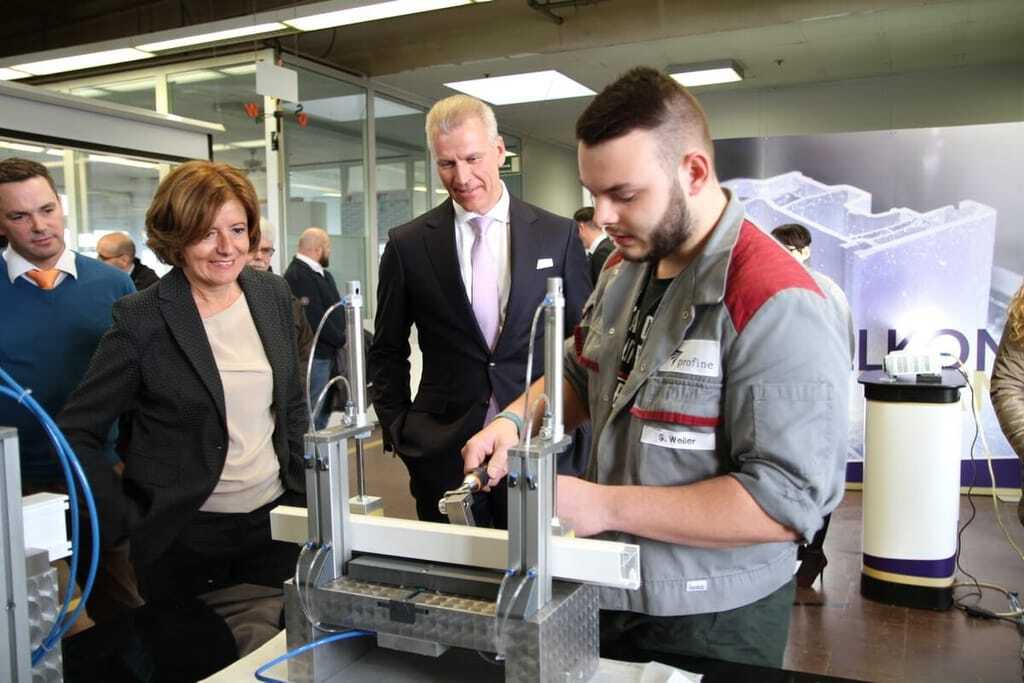 Nach einer Firmenpräsentation besuchte die Ministerpräsidentin die Produktionshallen, wo sie sich aus erster Hand erklären ließ, wie ein Extruder arbeitet. Von hier aus ging es direkt in den firmeneigenen Werkzeugbau und im Anschluss daran in die Ausbildungswerkstatt des Systemgebers.