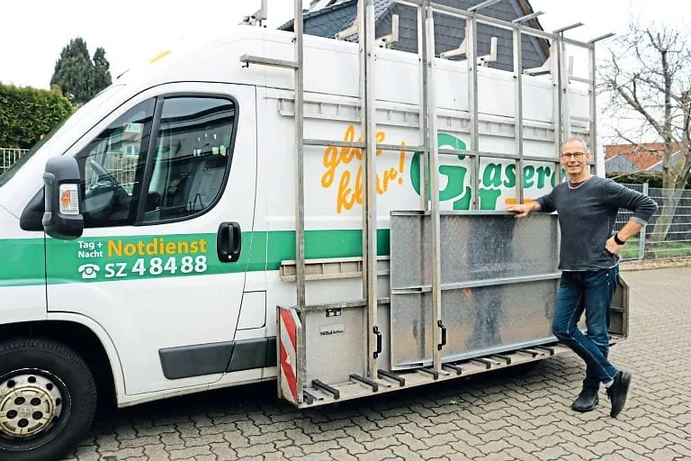 Die Glaserei Horn aus dem niedersächsischen Salzgitter setzt auf einen Saugroboter, der im firmeneigenen Transporter sicher mit Zurrgurten befestigt ist.