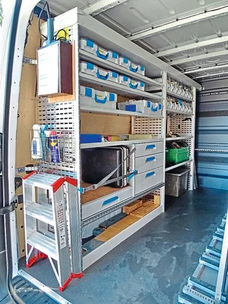 Auch Bauelemente, Werkzeuge & Co. dürfen nicht wahllos im Inneren des jeweiligen Fahrzeugs herumfliegen. „Die Kreissäge rutscht bei einer Vollbremsung schnell mal komplett durch den Transporter und gefährdet die Insassen“, mahnt Kleine. Hegla empfiehlt Kunden deshalb montagefreundliche Einbau-Regalsysteme wie Würth Orsy Mobil oder Sortimo.