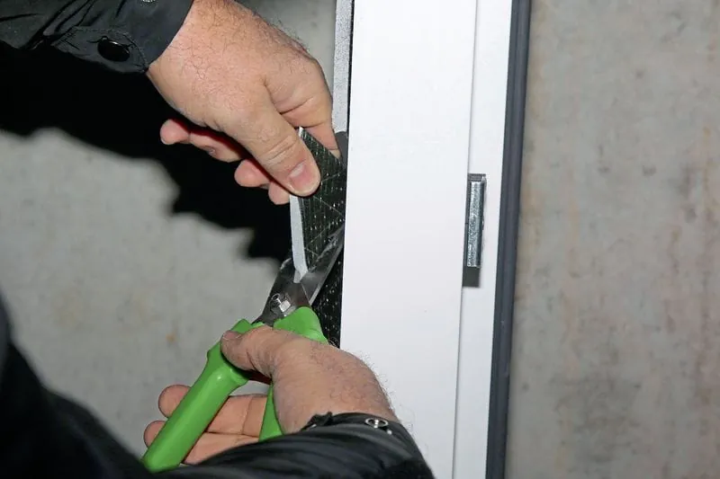 1. Schritt: Sparen Sie das Multifunktions-Dichtungsband Illmod Trioplex+ raumseitig an den vorgezeichneten Verklotzungspunkten aus, so dass eine dreieckige Ausnehmung für die spätere einbruchsichere Verklotzung entsteht.