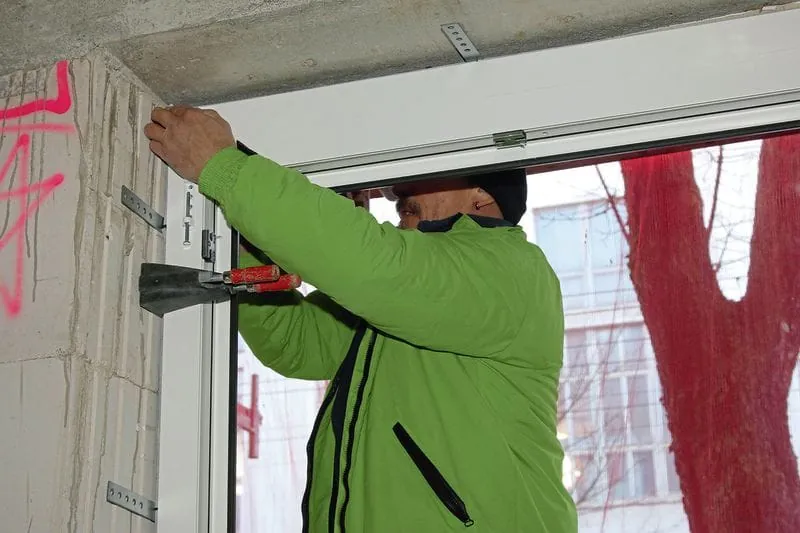 3. Schritt: Setzen Sie das Fenster in den Rahmen des Vorwandmontage-Systems und richten Sie es aus. Die Konstruktionszargen des Systems befestigen Sie zuvor um die Fensteröffnung herum; die Klebung trägt die Lasten linienförmig ab.