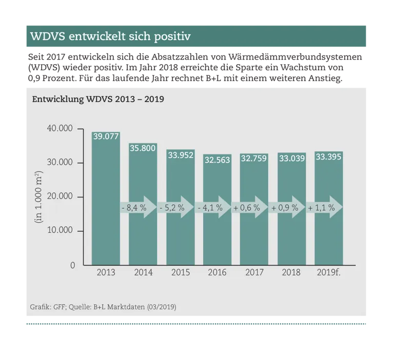 Bereits im Jahr 2017 fand der negative Trend beim Absatz von Wärmedämm-Verbundsystemen (WDVS) ein Ende. Diese positive Entwicklung hat sich auch im Jahr 2018 fortgesetzt mit einem Wachstum von 0,9 Prozent bei den erstellten WDVS-Flächen. Vor allem die Nachfrage aus Sanierungsprojekten habe sich stabilisiert. Den sehr schwachen ersten drei Monaten 2018 folgten drei Quartale mit Pluswerten von bis zu 5,8 Prozent im vierten Quartal im Vorjahresvergleich, so dass sich insgesamt ein geringfügig positives Bild zeichnen lässt.