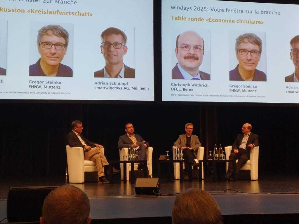 Auf dem anschließenden Podium sprachen die Referenten Adrian Schlumpf, Urs-Thomas Gerber und Gregor Steinke zusammen mit Christoph Wüthrich vom Bundesamt für Bauten und Logistik über die Kreislaufwirtschaft. Diskutiert wurde darüber, dass in den nächsten Jahren deutlich mehr Kunststofffenster zur Entsorgung anfallen werden und dass es in der Schweiz gar kein Werk gibt, das den anfallenden Werkstoff aufbereiten könnte. Weitere Themen waren der Produktepass, und dass sich Recycling in der Schweiz aktuell nicht rechnet.