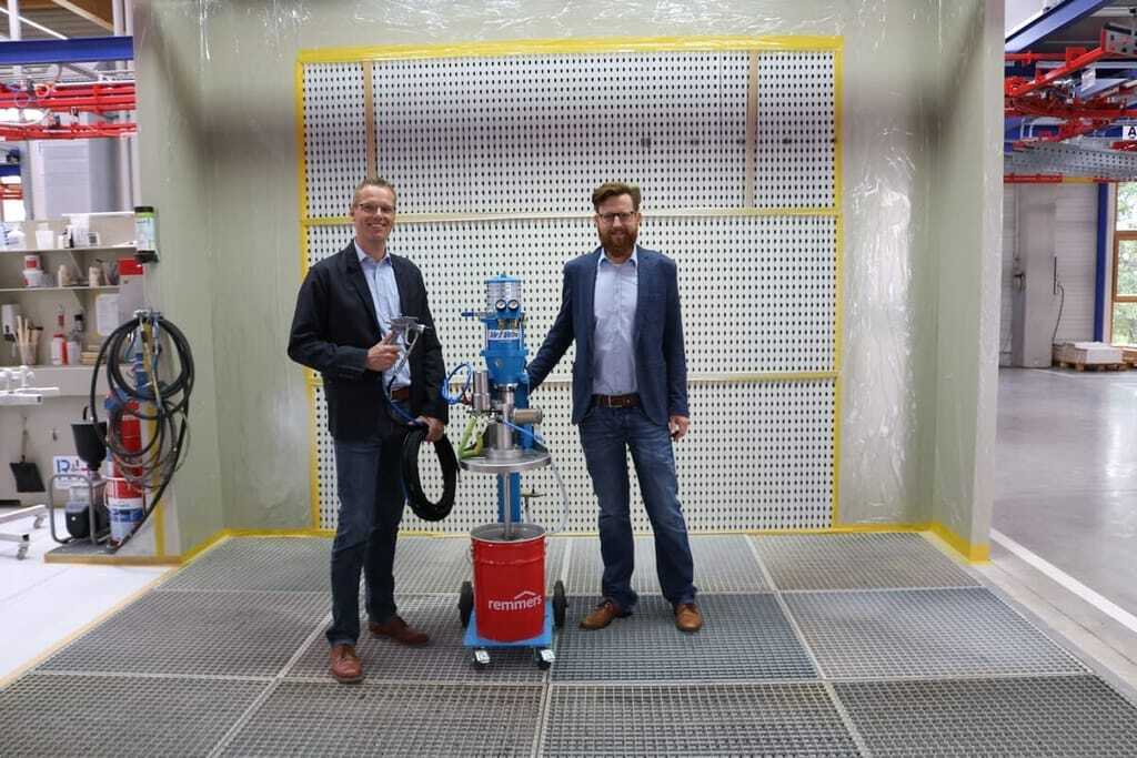 Sebastian Schmitt (re.), Regionaler Verkaufsmanager bei WIWA Wilhelm Wagner, übergibt die neue Lackierpumpe Phönix an Elmar Kaiser, Bereichsleiter RTS Remmers Technik Service im Geschäftsbereich Holzfarben und Lacke. - © Remmers