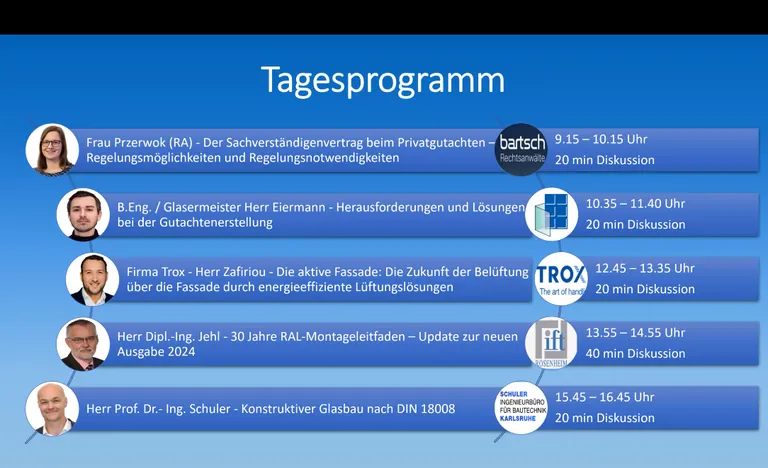 Ferner stehen u.a. auf dem Programm: Jan Eiermann vom GFF BW über Herausforderungen der Gutachtenerstellung, Emanuil Zafiriou von der Trox GmbH über die Zukunft der Belüftung über die Fassade, Wolfgang Jehl vom ift Rosenheim gibt ein Update zum RAL Montageleitfaden 2024 sowie Prof. Christian Schuler vom gleichnamigen Ingenieurbüro in Karlsruhe zum Konstruktiven Glasbau nach DIN 18008.