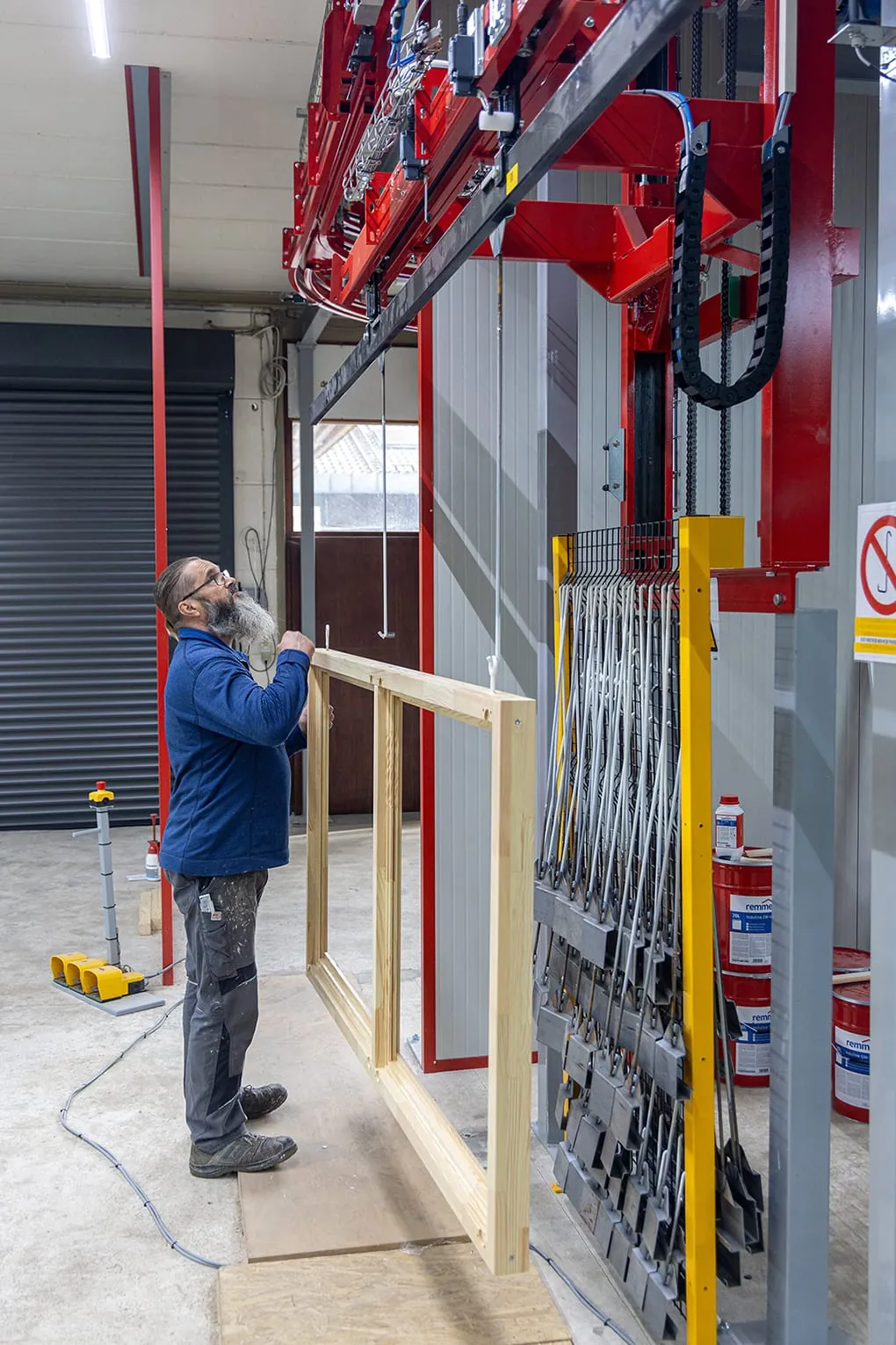 Vorarbeiten für das Lackieren der Fenster. Rechts die neue Lackieranlage von Finiture.