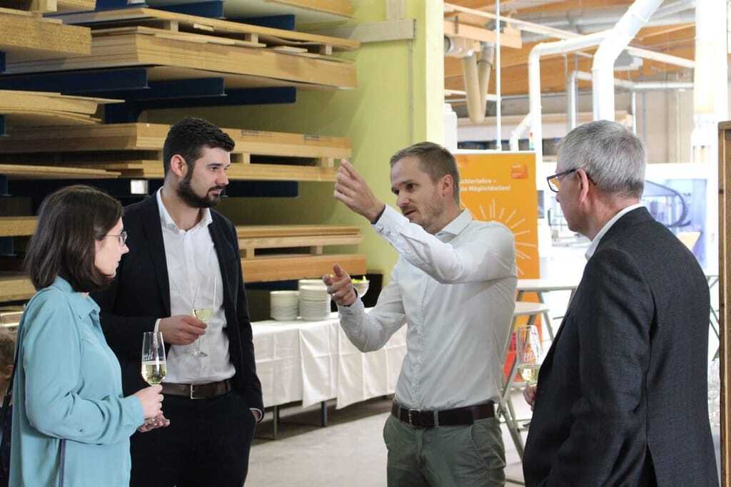 Anschließend führten die Gastgeber Jörg und Hubert Schmitt ihre Gäste durch den Familienbetrieb, bevor es beim anschließenden Empfang in der Fertigungshalle der Tischlerei zu interessanten Gesprächen bei gutem Essen und angenehmer Musik kam.