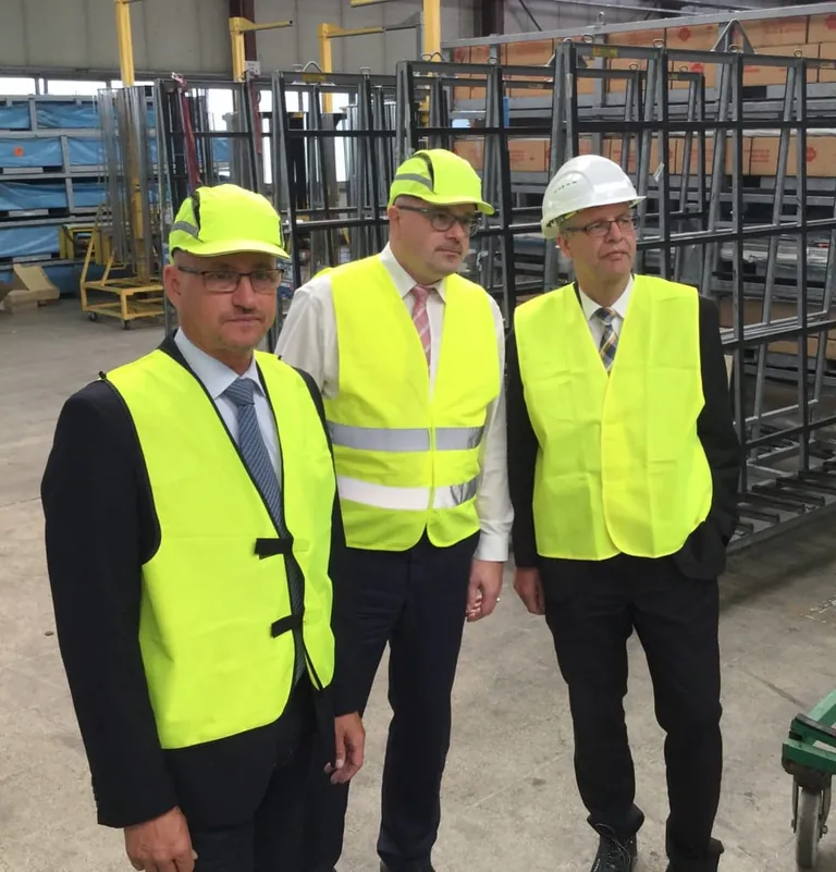 Der Umweltpolitiker und CDU-Bundestagsabgeordnete Christian Hasse besuchte auf Einladung von Geschäftsführer Dr. Lars Schlieper das neu erworbene Werk im lippischen Augustdorf. Mit zirka 150 Mitarbeitern werden dort Isoliergläser für die Bereiche Sonnen- und Schallschutz sowie Sicherheitsgläser produziert. Diese finden vor allem im Innenausbau oder der Fassade ihre Anwendung. Zusammen mit Niederlassungsleiter Michael Dobbe sprach Schlieper über die aktuellen wirtschaftlichen Rahmenbedingungen sowie aktuelle baupolitische Entscheidungen und zukünftige Weichenstellungen.