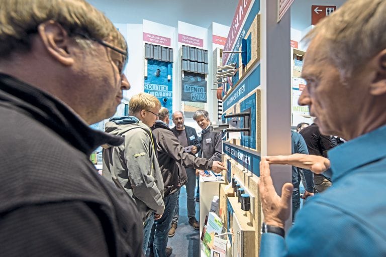 Unter den bekannten Produkten nehmen die sieben Artikel des Pro Clima Kernsystems einen besonderen Platz ein: Nach dem Mini-Max-Prinzip genügen nach Unternehmensangaben zwei Bahnen, drei Klebemittel, ein Nageldichtband und eine Grundierung, um nahezu jede Bauaufgabe hinsichtlich der Abdichtung der Gebäudehülle zuverlässig zu lösen. Werden die Anforderungen individueller, stehe das Komplettsortiment von Pro Clima zur Verfügung. Wie das Mini-Max-Prinzip funktioniert und wie die Verarbeiter davon profitieren, erklären die Techniker am Messestand. Diese beantworten freilich auch individuelle Fragen. Unter dem Motto „Pro Clima Baubesprechung“ finden jeden Tag am Messestand Fachberatungen statt zu den Themen Flachdach – sicher nach Norm und Gesetz, gesünderes Gebäude – worauf zu achten ist, Fensteranschluss – dauerhaft funktionsfähig sowie RAL-konform abdichten, Dachsanierung von außen – praxisgerechte Lösungen finden, Unterdeckung/Unterdach: die Regeln des ZVDH einfach erfüllen sowie Winterbaustelle – den Feuchteschutz im Griff behalten.