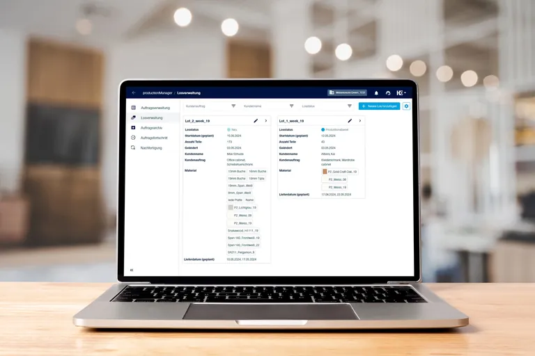 Mit der digitalen Auftragsmappe, dem Production Manager, können Homag-Kunden nicht nur ihre Aufträge verwalten und den Auftragsfortschritt in Echtzeit verfolgen, sondern auch die Nachfertigungsbauteile erfassen. Mit der neuen Funktion zur Losbildung lassen sich Aufträge ab sofort einfach zu Fertigungslosen zusammenfassen.