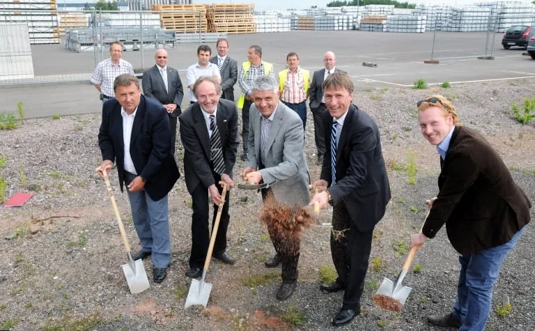 Gerhard Schwager als Mitglied der Geschäftsführung (COO) und Dr. Bernhard Matheis als Oberbürgermeister der Stadt Pirmasens nahmen gemeinsam den Spatenstich für den Ausbau der Lager- und Logistikfläche der Profine GmbH vor.