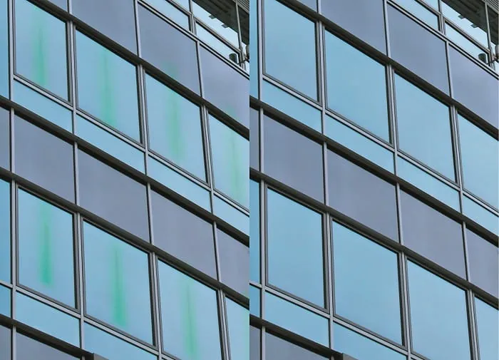 Arcon Glas bietet thermisch vorgespannte Gläser an, die bei entsprechendem Lichteinfall keine optisch störenden Anisotropien zeigen; zum Vergleich: mit Anisotropien (links), ohne Anisotropien (rechts). - © Arcon Glas