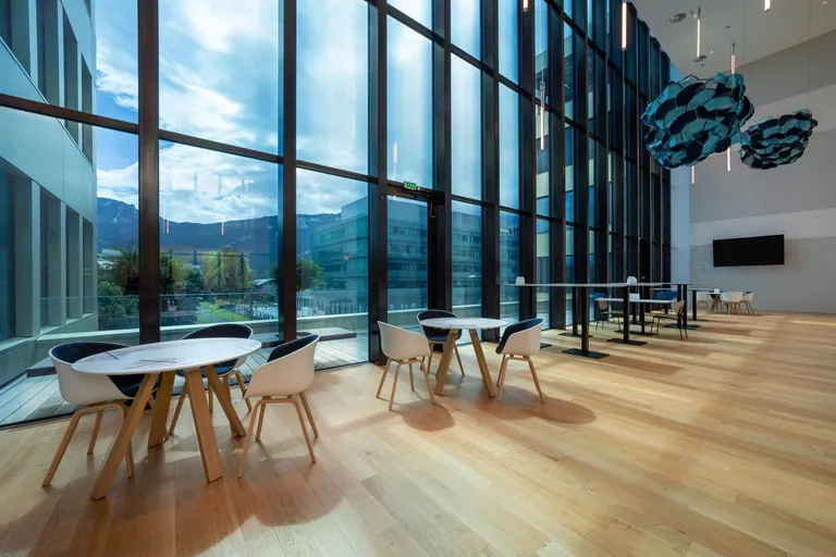 Das elektrochrome SageGlass verändert seine Helligkeit als automatische Reaktion auf die Sonneneinstrahlung. Dies erhöht den thermischen Komfort im Innenraum, ohne den Sichtbezug zum Außenbereich zu beeinträchtigen. - © SageGlass, Valentin Napoli