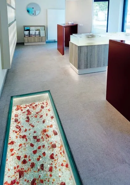 Der Showroom illustriert ungewöhnliche Gestaltungsmöglichkeiten wie einen eingelassenen begehbaren Glasboden mit individuell gestaltbarer Füllung.