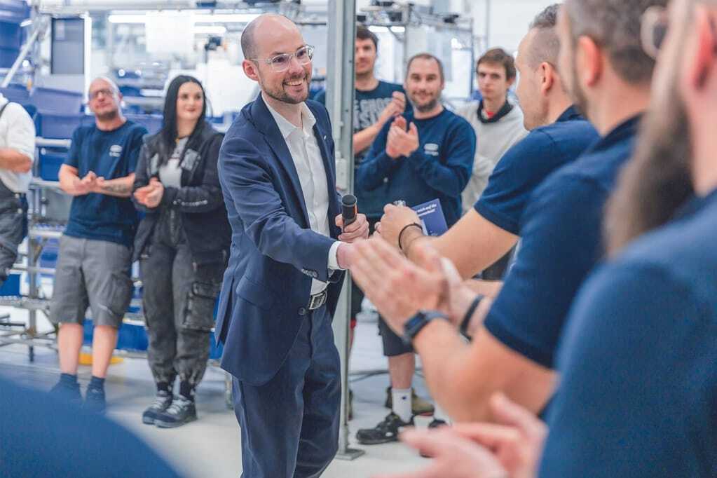 Zum Auftakt begab sich Dr. Johannes Schmalz auf einen Begrüßungs-Rundgang über das Firmengelände. Dort durchlief das neue Geschäftsführungsmitglied die verschiedenen Abteilungen und wurde von den insgesamt 1.800 Mitarbeitenden der Schmalz Gruppe herzlich begrüßt – in persona am Standort Glatten und per Video von den Mitarbeitenden der weltweiten Standorte. Als kleines Antrittsgeschenk brachte der promovierte Ingenieur Pralinen mit Schmalz Logo für alle Beschäftigten mit, um die ausreichende Schokoladen-Versorgung sicherzustellen, wie Dr. Johannes Schmalz mit einem Augenzwinkern anmerkte.