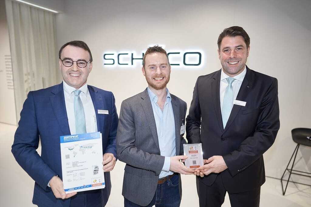 Edward Lowes (Mitte) vom Passivhaus Institut übergibt das Zertifikat an Markus Herbst (re.), Sprecher der Geschäftsleitung der Schüco Polymer Technologies KG und Christian Fischer, Leiter Technik der Schüco Polymer Technologies KG. - © Schüco International KG / Schüco Polymer Technologies KG