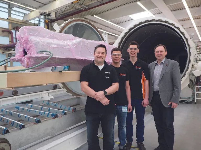 Ungewöhnlicher Einsatz für den Sedak-Autoklaven: Anstelle übergroßer Glaslaminate härtete jetzt ein Rennwagen-Chassis im Überdruckkessel aus. Die Aktion gehörte zum Sedak-Sponsoring für das Nachwuchs-Racing-Team Starkstrom Augsburg. Die Crew nimmt 2016 zum fünften Mal am Wettbewerb Formula Student Germany teil.