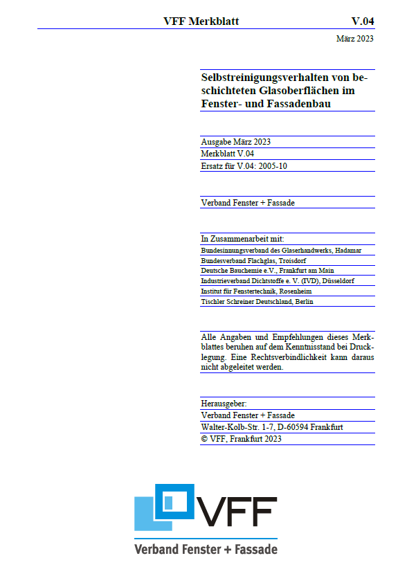 Das VFF-Merkblatt V.04 Selbstreinigungsverhalten von beschichteten Glasoberflächen im Fenster- und Fassadenbau kann im VFF-Shop bestellt werden.