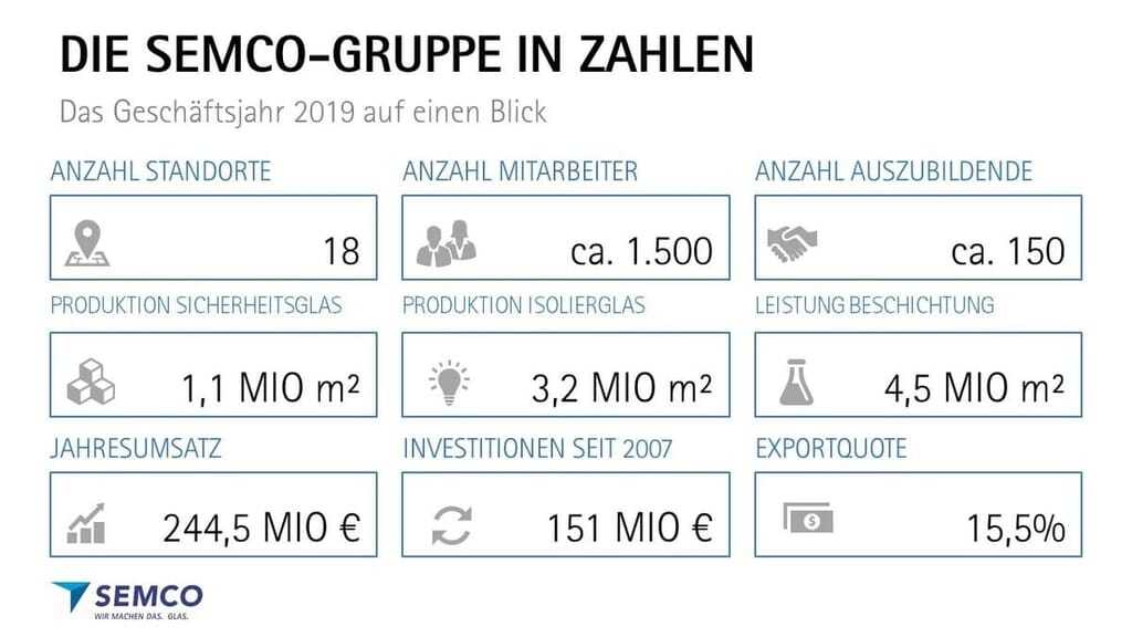 Im Jahr 2019 konnte die Semco-Gruppe ihren Gesamtumsatz an den 18 Standorten um 6,2 Prozent auf 244,5 Millionen Euro steigern. Davon entfielen rund 15,5 Prozent auf Exporte in 24 Länder. Mit seinen rund 1.500 Mitarbeitern produzierte das Unternehmen 3,2 Millionen Quadratmeter Isolierglas und mehr als eine Million Quadratmeter Sicherheitsglas. Die Menge an beschichteten Gläsern legte um 2,3 Prozent auf 4,5 Millionen Quadratmeter zu.