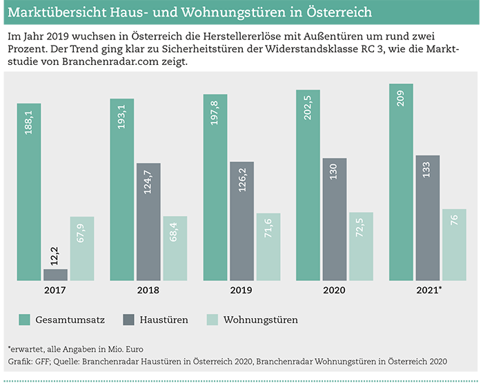 2019 wuchsen in Österreich die Herstellererlöse mit Außentüren um zirka zwei Prozent. Die aktuelle Marktstudie von Branchenradar zu Haus- und Wohnungstüren zeigt: der Trend hin zu Sicherheitstüren der Widerstandsklasse RC 3.