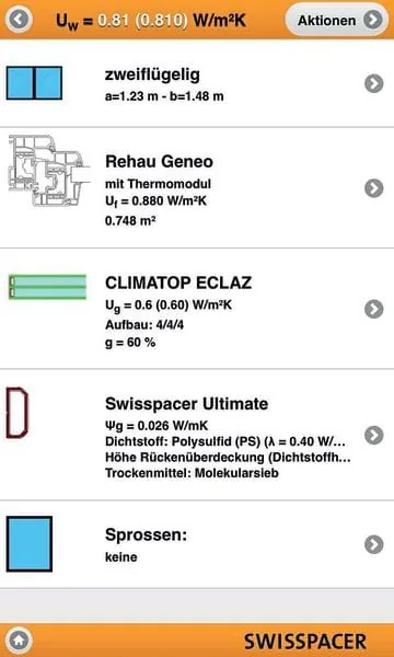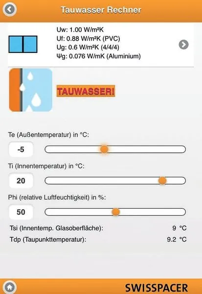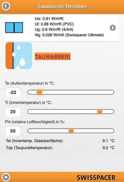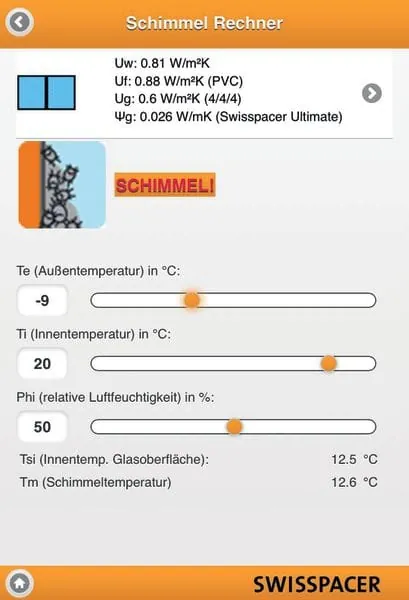 Im Swisspacer Tool Caluwin sind viele Fensterkomponenten (Profile, Isoliergläser und Abstandhalter) fest hinterlegt und lassen sich in verschiedener Weise zusammenstellen. Für jegliche Kombinationen sind dem Unternehmen zufolge bereits die genauen Psi-Werte (linearer Wärmedurchgangskoeffizient) und fRsi-Werte (Temperaturfaktor) hinterlegt. So lasse sich einfach und verlässlich für jede Klimasituation die Gefahr einer Tauwasser- oder Schimmelbildung bestimmen.