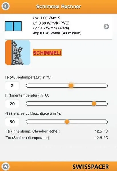 6. Schritt: Wechseln Sie über das Hauptmenü zum Schimmel-Rechner und verfahren Sie wie oben beschrieben. Beim Fenster mit Alu-Abstandhalter wird bei einer Außentemperatur von drei Grad Celsius die Schimmeltemperatur unterschritten; es setzt Schimmelbildung ein.