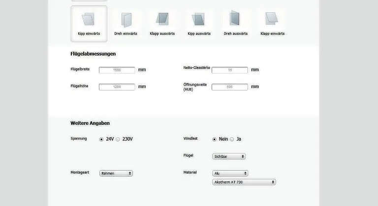 Den Antriebsrechner habe Esco so entwickelt, dass er immer den kleinstmöglichen Antrieb für das zuvor definierte Fenster ausweist. Auswahlkriterien sind die Öffnungsart, die Flügelabmessung, die Glasdicke und die Öffnungsweite sowie die Spannung, außerdem die gewünschte Montageart und das Profilmaterial, aus dem das Fenster gebaut werden soll. Als Ergebnis erhält der Kunde eine detaillierte Darstellung mit den technischen Daten zu den passenden Antrieben, die er sich auch als pdf-Datei ausdruckt.