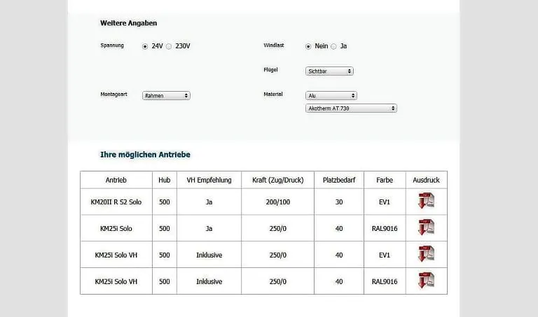 5. Schritt: Sie erhalten eine Aufstellung der möglichen Antriebe. In den dazugehörigen pdf-Dateien finden Sie Details zum Antrieb sowie entsprechende Einbaupläne.