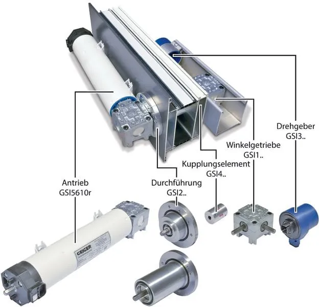 Aus diesen Komponenten besteht das von Geiger entwickelte Antriebssystem für Sonnenschutz in Closed Cavity Fassaden (CCF).