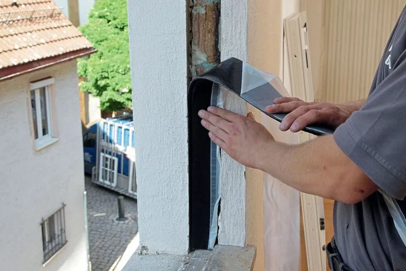 Iso-Bloco Reno setzten die Monteure an allen vier Seiten der Fensteröffnung ein. Bei der oberen Eckausbildung montierten die Fachleute das Band umlaufend, indem sie den Bandrücken an den Ecken scharfkantig umknickten. Im unteren Anschlussbereich klebten sie das Band direkt auf die äußere Steinfensterbank und kürzten es dann mit einem Cuttermesser auf Profilbreite. Da das langsam expandierende Abdichtungsmaterial nicht am Rahmen, sondern in der Mauerwerksvertiefung befestigt wird, blieben den Monteuren genug Platz und Zeit, die Fensterrahmen einzusetzen, zu justieren und zu befestigen. Für einen perfekten optischen Gesamteindruck versahen sie die Fenster abschließend mit einer Dichtstofffuge.