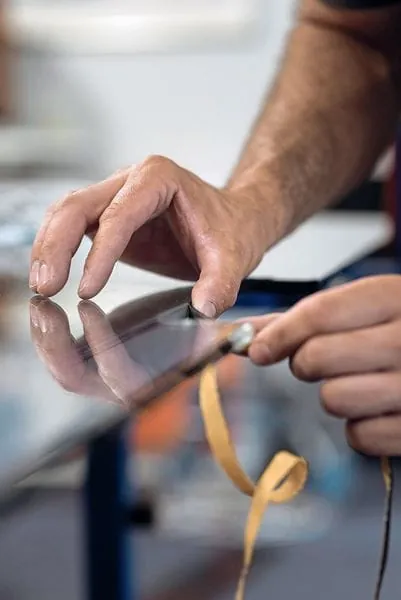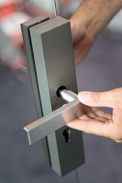 3. Schritt: Montieren Sie den Schlosskasten in die dafür vorbereitete Ausnehmung. Auch hier schützen Kunststoffplatten und Filzstreifen das Glas.