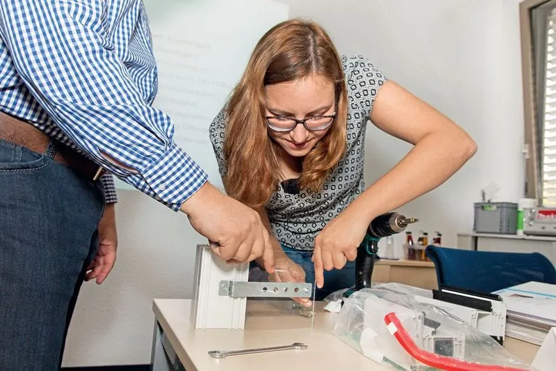 Übung macht den Meister: GFF-Redakteurin Andrea Mateja versucht sich an der Montage einer Absturzsicherungslasche.