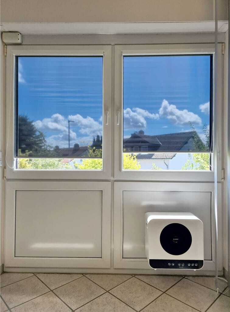 Das Klimagerät kommt bereits betriebsfertig mit Kältemittel gefüllt zum Fensterbauer. Die Installation erfolgt mit einer Halteplatte beim Einglasen des Fensters. Nach Herstellerangaben entfallen dadurch erhebliche Montagekosten, da keine Inbetriebnahme durch einen Fachbetrieb erforderlich ist.
