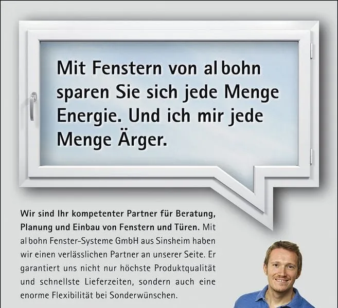 Der Sinsheimer Hersteller Al Bohn Fenster-Systeme hat das sprechende Fenster erfunden. Die cartoonartigen Sprechblasen in Anzeigen und Online-Auftritten sollen ein Alleinstellungsmerkmal schaffen und die Verarbeiter werblich unterstützen. „Das sprechende Fenster hilft uns, unsere Service- beziehungsweise Mehrwert-Strategie zu kommunizieren, denn wir haben mehr als nur einfach ein Produkt zu bieten“, erklärt dazu Al-Bohn-Geschäftsführer Matthias Feldhoffer. Als Beispiel in diesem Zusammenhang nennt er den umfassenden Kundenservice vor, während und nach dem Kauf. Dazu gehöre u.a. die Unterstützung der Schreiner, Fensterbauer und Bauelementehändler bei deren Werbemaßnahmen vor Ort. Das neue Key-Visual helfe ihnen dabei, die Endkunden mit einem einprägsamen Motiv ganz direkt anzusprechen.