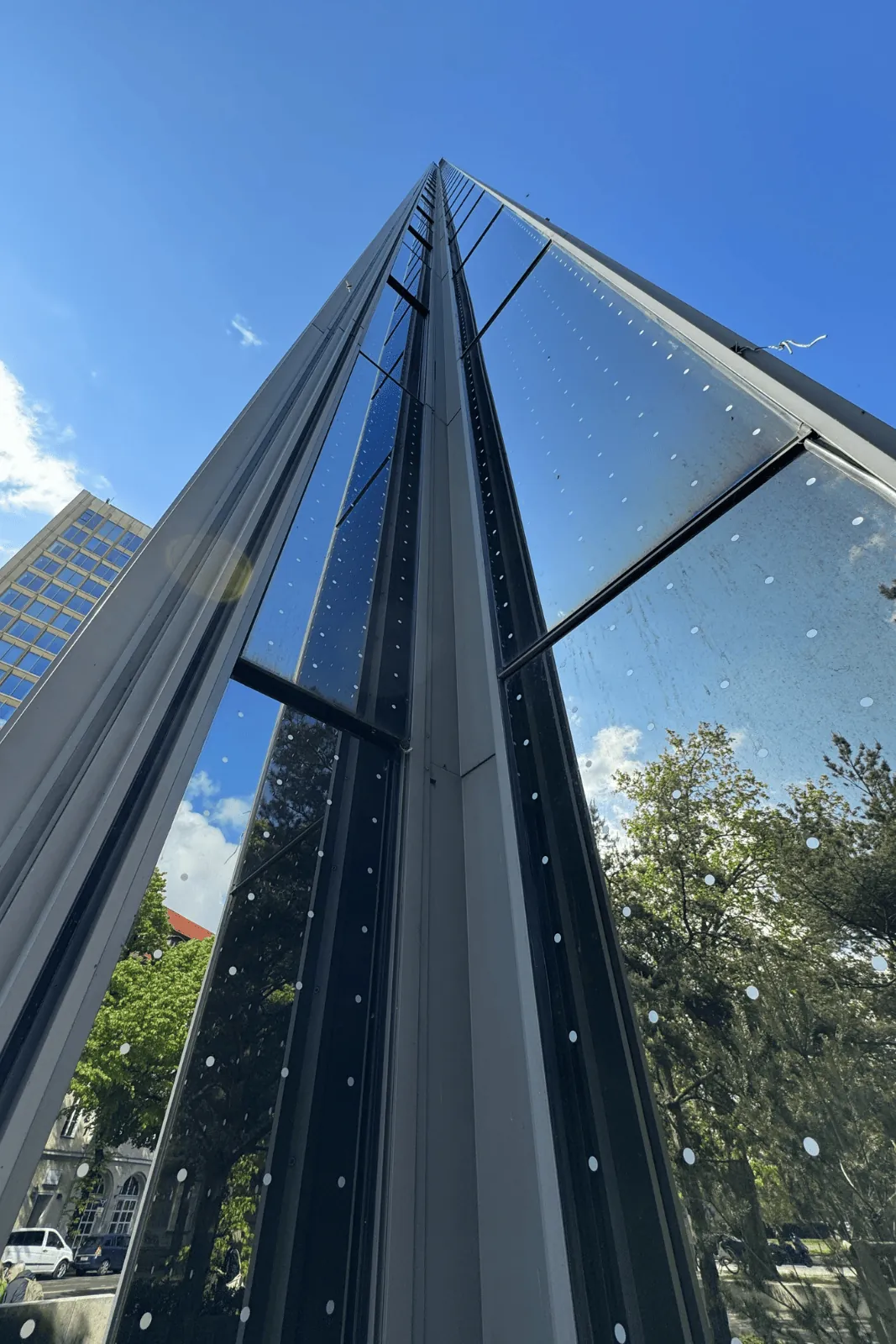 Städtische Glasfassaden stellen für Vögel eine erhebliche Gefahr dar. Die spiegelnden Oberflächen reflektieren Himmel und Vegetation und sind für die Tiere kaum als Hindernis erkennbar. Am Axel-Springer-Hochhaus in Berlin kam daher eine Vogelschutzmarkierung zum Einsatz, die funktionalen Schutz bietet und gleichzeitig die Optik der Fassade erhält.