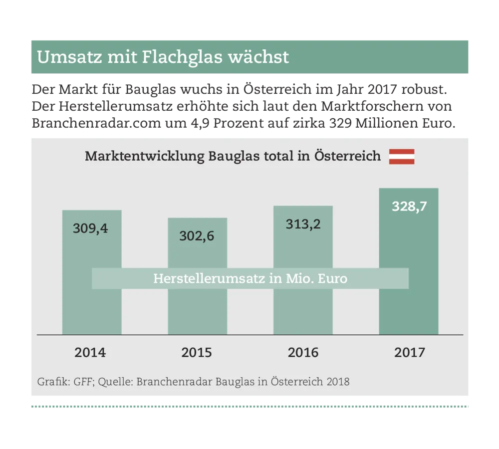 home / News / Glas / Stärkere Nachfrage nach Glasfassaden Glas - 8. Juni 2018 Branchenradar.com Marktanalyse Stärkere Nachfrage nach Glasfassaden Der Herstellerumsatz mit Flachglas wächst in Österreich. Angeschoben wurde der Markt laut Branchenradar.com Marktanalyse von einer steigenden Nachfrage nach Fenstern und insbesondere nach Glasfassaden – die montierte Fläche erhöhte sich demnach um 9,6 Prozent im Vergleich zum Vorjahr. Die Erlöse stiegen in allen Produktgruppen: Bei Isolierglas um 5,9 Prozent, bei VSG um 8,8 Prozent und bei ESG um 2,8 Prozent. - © Grafik: GFF; Quelle: Branchenradar Bauglas in Österreich 2018 keyboard_arrow_left Zurück zur Startseite
