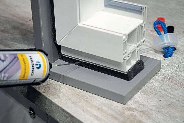 Der Dicht- und Dämmexperte Hanno vereinfacht mit seinem neuartigen Injektionsklotz die Montage von Fenstern, Türen und Fassaden. Dieser ermöglicht die nachträgliche Herstellung druckfester Bereiche in vorkomprimierten (Multifunktions-)Fugendichtungsbändern – das sonst übliche Verklotzen entfällt. Das Injektionsharz aus Polyurethan injiziert der Verarbeiter mit handelsüblichen Dichtstoffpistolen punktuell in fertig eingebaute PU-Weichschaumbänder. Dort härtet es vollständig aus und verklotzt den Rahmen fest und sicher – beispielsweise zur Hinterfütterung von Beschlägen. Der Monteur muss das Dichtband somit nicht ausklinken; die sonst üblichen Einschnitte oder Auskerbungen für mechanische Klötze entfallen.