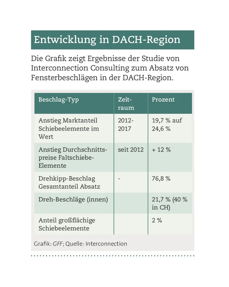 Die weiterhin guten Rahmenbedingungen für die Bauindustrie verortet Holger Koch vor allem bei der großen Nachfrage nach Wohnungen, in der demografischen Entwicklung und auch in der niedrigen Zinssituation. „Ob es für den Neubau von Mehrfamilienhäusern zusätzliche Abschreibungsmöglichkeiten geben wird, hängt von der zukünftigen Bundesregierung ab. In den Wahlprogrammen sahen jedenfalls alle Parteien einen hohen Bedarf, bezahlbaren Wohnraum zu schaffen“, fügt er hinzu. Keine detaillierten Zahlenangaben haben wir dazu gefunden, welche Fensterbeschläge speziell in Deutschland am gefragtesten sind. Dennoch gibt es Zahlen, aber für die DACH-Region: Eine aktuelle Studie von Interconnection Consulting in Österreich beschäftigte sich mit dem Absatz von Beschlaggarnituren auf allen drei Märkten.