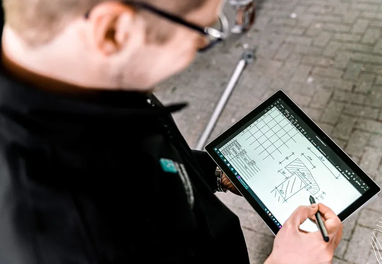 Brammertz erstellt das Aufmaß mit Tablet (Microsoft Surface), OneNote und Lasermessern. "Wir arbeiten mit 3D-Laser-Aufmaß als Punktwolken-Scan. Dabei nutzen wir die digitale Eingabe mit einem Stift direkt auf den Tablet-Bildschirm." So können die Monteure direkt auf der Baustelle ein Foto machen und das Foto direkt auf dem Bildschirm mit handschriftlichen Infos oder Maßen versehen. Diese Informationen sind dann direkt im digitalen Kundenordner für alle zu finden, weitere Übertragungsarbeiten entfallen.