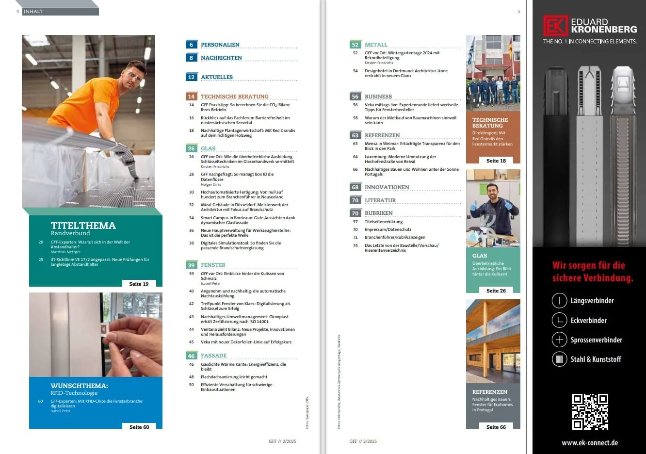 Am 11. Februar erscheint die GFF-Ausgabe 2/25. Im Titelthema geht es um Trends und Entwicklungen mit Blick auf den Isolierglas-Randverbund. Das Wunschthema behandelt die Frage, wie Fensterbauer von RFID-Chips an den Elementen profitieren. Details und weitere Themen lesen Sie hier.