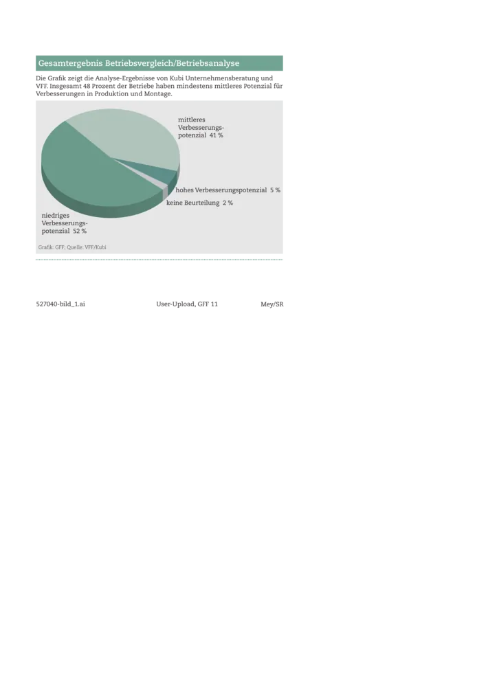 Insgesamt betrachtet besteht laut Analyse bei 52 Prozent der Firmen ein geringes Verbesserungspotenzial, bei 41 Prozent ein mittleres Verbesserungspotenzial und bei zirka fünf Prozent ein hohes Verbesserungspotenzial über alle genannten Bereiche hinweg. Ins Auge fällt dabei das Resümee zu den Punkten Produktion und Montage auf der Baustelle. Während bei der Produktion die Unterpunkte Organisation und Ausstattung ein eher geringes Verbesserungspotenzial aufweisen, ergab die Analyse hinsichtlich der Aspekte Materialfluss/Arbeitsweise sowie Produktivität immerhin ein mittleres Verbesserungspotenzial.