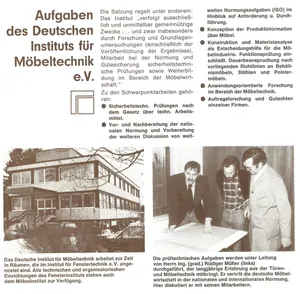 Neben dem Aufbau des Labors für Türentechnik war ich involviert in die nationale, europäische und internationale Normungsarbeit sowie in die Überarbeitung der RAL Güte- und Prüfbestimmungen für Fenster einschließlich Überwachung von zirka 200 Herstellern. Der Bekanntheitsgrad des ift führte zu dem Entschluss, in Rosenheim neben Fenstern und Türen auch Möbel zu prüfen. Daher wurde 1979 das Deutsche Institut für Möbeltechnik gegründet. In der damaligen Baracke übernahm ich die Laborleitung und führte unter anderem Prüfungen und Forschung an Polster- und Kastenmöbeln durch.