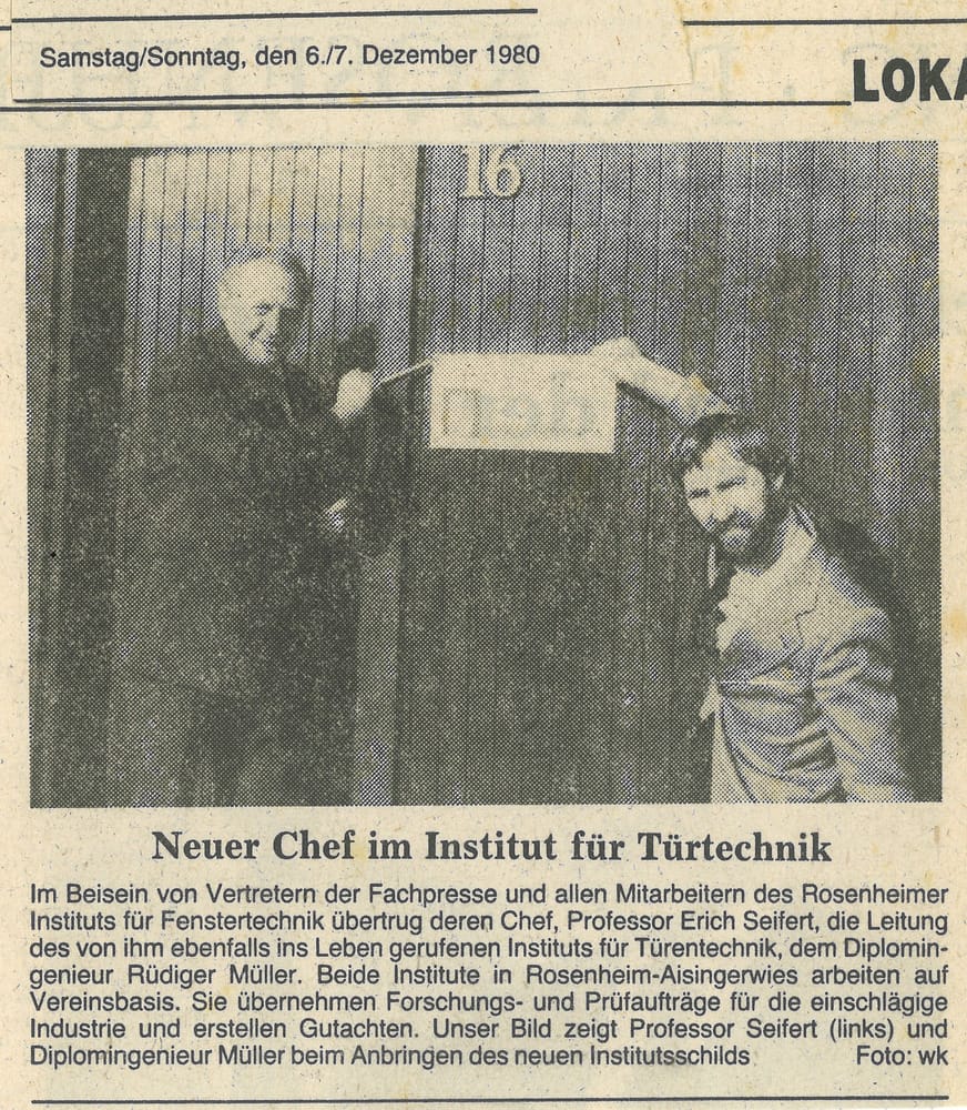 Insgesamt prägte ich über zwölf Jahre als deutscher Vertreter für Normungsarbeiten den Bereich Fenster und Türen. Neben dem Abschluss der Forschungsarbeiten Innentüren führte ich die Forschungsarbeit Anforderungen an Wohnungseingangstüren durch. Im Dezember 1980 erfolgte mit eigenem Briefkopf und Signet die Gründung des Labors für Türentechnik am Institut für Fenstertechnik. Zu dieser Zeit wurde ich zum Laborleiter ernannt.