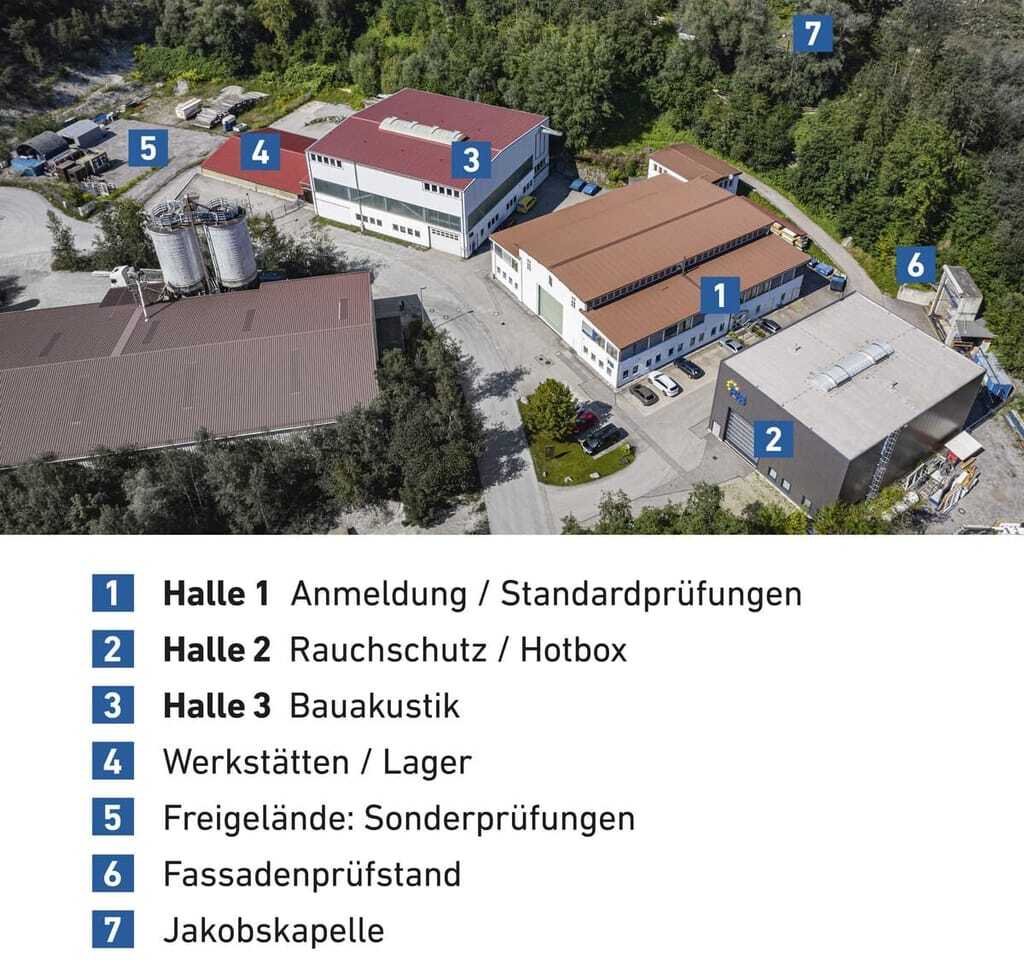 Luftbild des heutigen PfB Prüfzentrum für Bauelemente mit seinen grosszügigen Prüfhallen und Freiflächen - © PfB