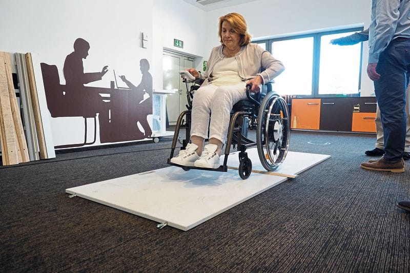 Daran will der ift-Chef nicht rütteln. Vielmehr biete das Kriterium der Überrollbarkeit Vorteile für die Sanierung und Bewertung neuer Produkte. Recherchen für die GFF -Praxistage am 8. und 9. November in Karlsruhe-Ettlingen (dort spielt das Thema in der Podiumsdiskussion und im Eröffnungsvortrag von Sandra Heinrichsberger eine Rolle) hatten ergeben, dass in diesem Sektor tätige Bauunternehmen mit Unverständnis auf das vermeintliche Zurückdrehen der Anforderungen seitens der Fensterbranche reagieren. Dazu passt, was während der vor allem hinsichtlich der Temperaturen heißen Runde im Juli Ferdinand Schusser sagt, der Alumat in Österreich und der Schweiz vertritt und seitenweise erfolgreiche Referenzbelege vorlegt. „Mit dem Thema der Überrollbarkeit machen wir ein neues Fass auf, das zusätzlich für Verwirrung sorgt.“ Alumat trete seit Langem den Beweis an, dass die Lösung nicht nur für alle Nutzergruppen am komfortabelsten sei, sondern sämtliche Prüfungen – von der Schlagregendichtigkeit (laut Rager-Frey wird, egal mit welchem Profilhersteller, mindestens die Klasse 9A erreicht) über Blower Door bis hin zum Einbruchschutz – bestanden habe. „Dieses Produkt“, lässt sich Helmut Hilzinger in Bezug auf die Magnetdoppeldichtung zitieren, „wird mehr als dringend gebraucht und Hilzinger als innovative und große Fenstermarke ist ganz vorn mit dabei“ – diese Aussage liegt GFF schriftlich vor und deckt sich mit Empfehlungen, die Kornelia Grundmann, selbst Rollstuhlnutzerin, mit ihrer Agentur gabana (ganzheitlich, barrierefrei, nachhaltig) ausspricht. Sie berät Bauvorhaben wie Center Parcs Allgäu in Sachen Barrierefreiheit. Auch ihre Projektliste ist beeindruckend, es finden sich u.a. die Tourismuschefin von Kitzbühel und eine sehr zufriedene Partnerin der Deutschen Bahn. Nicht selten komme es vor, dass weder Architekten noch Bauausführende über das notwendige Know-how verfügen, um Barrierefreiheit richtig umzusetzen und dieses Versprechen einzulösen. Die Leidtragenden seien die späteren Bewohner, vor allem jene, die auf Barrierefreiheit angewiesen seien. Ebenso kritisch kommentiert sie, wenn Betriebe – um Diskussionen zu vermeiden – von sich aus eine Zwei Zentimeter-Schwelle einbauen, weil sie damit die meiste Erfahrung hätten: „Es geht auch um Empathie“, sagt sie. Anderenfalls seien Nutzer der Wohneinheiten vom Terrassengenuss dauerhaft ausgesperrt. Am überzeugendsten ist das wirtschaftliche Argument in der Hotellerie: „Bei den Hotels, die wir beraten haben, sind die barrierefreien Zimmer die am besten gebuchten. Die sind am komfortabelsten, das hat nichts mit Rollstuhl oder Rollator zu tun.“ Die Unüberwindbarkeit rechteckiger Zwei Zentimeter-Schwellen bestätigen die ift-Forschung und Messungen zur Überrollbarkeit. Knut Junge verweist auf Selbstversuche in Seminaren: „Erfahren Teilnehmer oder Messebesucher erst selbst, dass eine Zwei Zentimeter-Schwelle unüberwindbar ist, braucht es keine Normen mehr. Die haben es für das ganze Leben verstanden.“