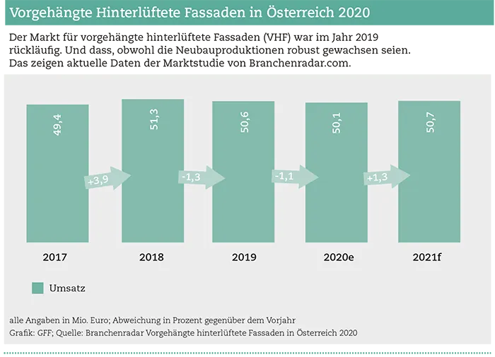 Vor dem Hintergrund einer robust wachsenden Neubauproduktion, insbesondere im Objektbau, kommt die Nachricht unerwartet: Laut aktuellem  Branchenradar Vorgehängte hinterlüftete Fassaden in Österreich sinken im Jahr 2019 die Herstellerumsätze mit Bekleidungsmaterial für vorgehängte hinterlüftete Fassaden (VHF) um 1,3 Prozent gegenüber dem Vorjahr auf 50,6 Millionen Euro.
