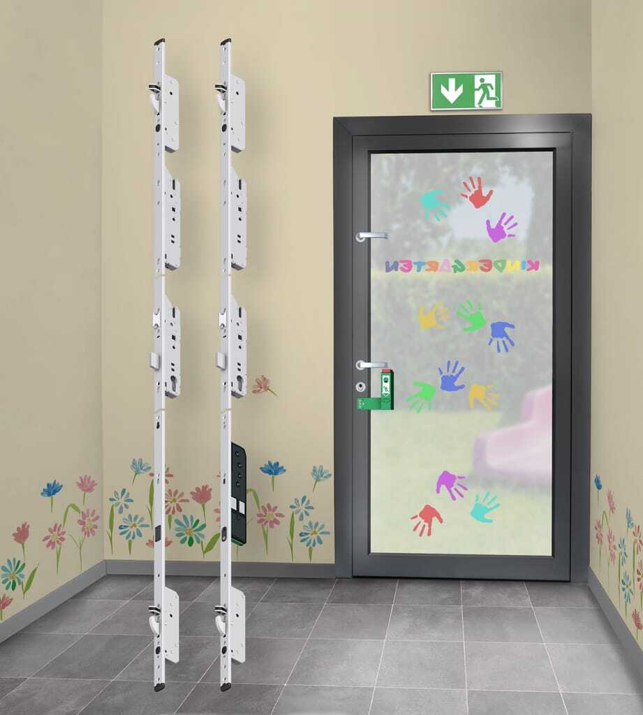 Neben der bekannten Verriegelung Autosafe 833P in Kindergarten-Ausführung mit Typ 4 Fallenriegel steht nun auch die Variante mit Typ 10 Duo Secure-Verriegelung, also mit Schwenkriegel und Fallenbolzen, als Autosafe 835P zur Verfügung. Durch beide Automatik-Mehrfachverriegelungen mit Doppel-Drücker und Panikfunktion wird sichergestellt, dass Kinder nicht unbemerkt nach draußen gelangen, jedoch den Kindergarten im Notfall ohne fremde Hilfe verlassen können. Ein Türwächter löst den Alarm aus, sobald der untere Drücker oder die Panik-Griffstange betätigt wird. Unabhängig davon können Erwachsene das Gebäude jederzeit durch die Betätigung des oberen Drückers verlassen, ohne den Alarm auszulösen. Falls die Zugangsregelungen über eine Zeitschaltuhr oder eine Zutrittskontrolle geregelt werden soll, lässt sich ein Motor nachrüsten.