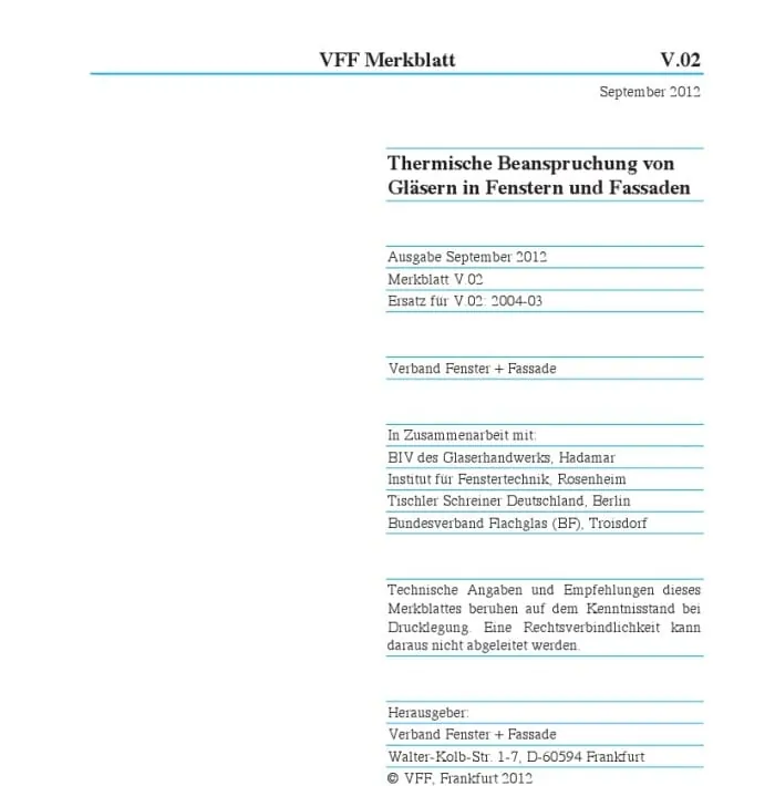Das Merkblatt beschreibt, wie Planer, Hersteller und Nutzer mit dieser Situation umgehen. Es gibt wesentliche Hinweise und liefert grundsätzliche Ansatzpunkte für eine Berücksichtigung thermischer Belastungssituationen. Dabei werden eine Reihe bekannter und häufig vorkommender Stresssituationen für das Glas beschrieben. Die Beurteilung möglicher Ausgangssituationen und die Erarbeitung von Lösungsvorschlägen basieren auf den Erfahrungen der Mitarbeiter des technischen Ausschusses des VFF.